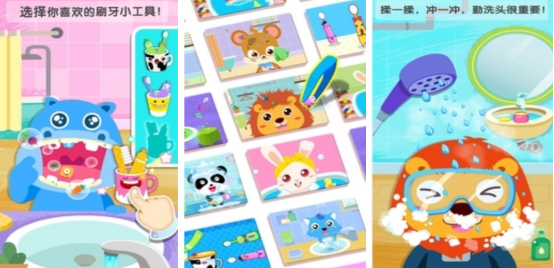 可培养孩子们讲卫生,爱干净的行为习惯,这里也有很多可爱的小伙伴等待大家帮助一起做清洁,比如河马需要刷牙,用牙刷在河马的嘴中来回滑动屏幕,就可让对方的牙齿变得非常干净。其次,特别可爱的琪琪又想洗澡,认真帮其擦身体或者是涂抹沐浴露,会让对方洗香香。跟着其中的人物角色,久而久之就能养成良好的个人行为习惯,比如睡前刷牙或者是睡前洗脸等。