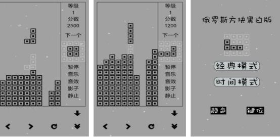 还原手持游戏机当中俄罗斯方块的特色欢乐时光采用黑白版本,有独特的多人冒险休闲互动玩法减少,采用黑白配色,减少视觉的干扰,为适应移动设备操作习惯,打造出虚拟按键控制模式,根据按键实时调整方块所在的位置,让不同玩家偏好都得以满足,除了有经典的挑战模式之外,又加入时间和宝石消除等特色规则。
