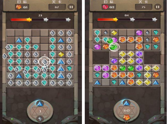 特别休闲又益智的消除手游,融入了各色形状以及颜色的宝石,适合各个年龄段的玩家进行体验,挑战的时候需要在每一个关卡里,仔细的观察宝石的形状以及颜色,将三个或以上相同颜色宝石连接并点击以后,就能消除。如果在玩的过程当中可以完成联机任务的话,也可以获得更高的分数,享受特别炫酷的视觉效果。