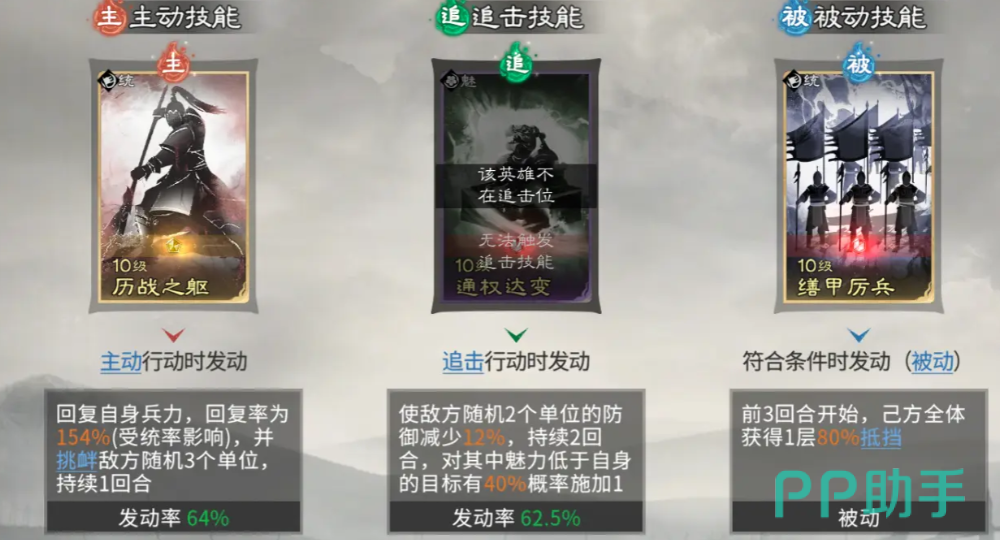 另外在孙权的技能当中,大家要注意给他带的是历战之躯,这个主动技能可以让他挑衅到对面的群体英雄时给自己带来兵力恢复,而另外被动技能就更适合带缮甲历兵,因为可以给我方的武将带来抵挡的状态加成,放在这里使用的话,孙权就可以让我方友军受到对面伤害的时候降低80%的数值,提升整体队伍需要的坦度,庞统放这里,因为他有一定的兵无常势主动技能可以进行搭配,所以对敌人血量目前比较低的敌人进行输出的话,会有一个定点的方式进行提升。