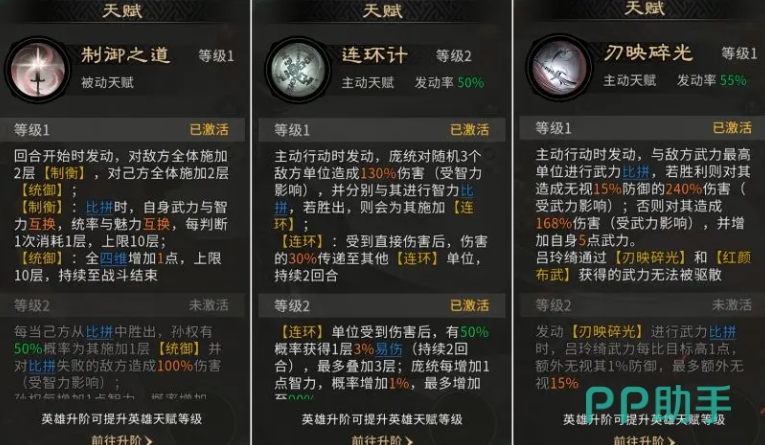 打出一些爆发输出也是基本利用这里的三个武将的天赋能力,也就是孙权的制衡之道,以及庞统的连环计,还有吕玲绮的刃映碎光,而在后期技能搭配效果上面,大家也是可以他们基础的天赋为主要能力来进行搭配,比如说吕玲绮在当前使用的技能卡上面可以带的是万军取首,这个技能卡本身给她带来的各种倍率加成就比较多,对于残血类型的英雄提升了更多收割效果,当中还有一定的输出提升,而后期追击技能可以同样使用万军取首,此时他只要踩中的是两个角色,那么触发此类技能可以打出来的输出也会更高,另外在被动技能卡上面可以用的是层锋叠刃,因为这个技能卡可以让她的天赋效果以及主动技能都变成单体的输出能力,此时触发了单体输出的话,可以额外触发一段输出,而且降低部分伤害之后,她的整体收益还是比基本的有所提升。