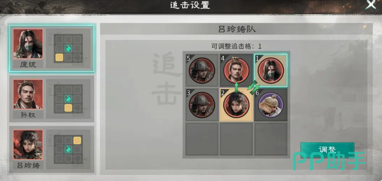 这个阵容当中可以用的角色有孙权、吕玲绮以及庞统,这个阵容在搭配效果上面要注重能否稳定的触发他们的自带天赋,这里兵种跟站位的效果当中一定要注意后排的双穿杨军,在给吕玲绮弥补一部分伤害之后,前期的输出效果上面一定要站孙权的追击,那么在后期庞统的这些格子上面也是可以利用踩追击格子的方位来进行采集的,这样才可以触发更多追击的能力,而庞统站吕玲绮的追击格子就可以了,孙权不踩追击格子,也让其中角色的能力得到最高的追击次数,而在整体队伍当中,孙权自带的天赋当中可以给敌人套上足够的制衡能力,在其中利用这样的状态可以比拼双方的数值,而根据其中互换的武力数值可以让庞统触发连环计的效果,这样敌人知道连环状态的时候,我方就可以给吕玲绮的天赋进行加成,锁定敌方目前武力数值比较高的英雄进行输出,那么就可以攻击敌人输出位置上面的角色了。