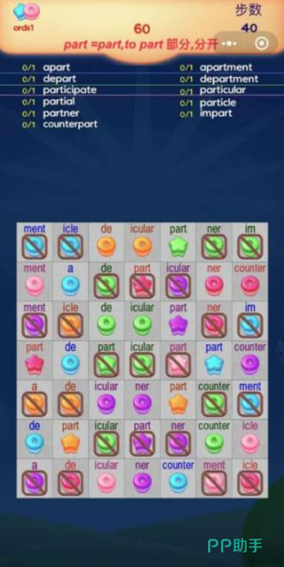 采用糖果主题视觉设计,每个方块印有字母或单词。玩家通过交换相邻元素组成三连及以上即可消除,成功消除时同步播放标准发音、显示音标及中文释义。任务体系覆盖水果、颜色等基础词类,并逐步拓展至学科术语与生活短语;部分关卡设步数限制或指定目标单词达成条件。特殊道具如彩虹糖可清除整行,闪电链随机消除多个方块,有效降低操作门槛。单词树系统实时追踪学习成果——每掌握一个新词即生长一片叶子,累计达量后可兑换专属皮肤与动画奖励。全功能支持离线运行,无网络环境亦可持续使用。