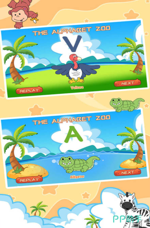 以森林生态为背景,26个英文字母化身不同动物角色:长颈鹿对应字母G,伸长脖子发出标准英式读音;狮子守护字母L,伴随吼声呈现完整单词。孩子轻点动物图标即可触发发音、显示字母与单词,并同步开展望远镜观察、拼图匹配、拟声模仿等多元任务。关卡由浅入深,从单字母识别逐步过渡到基础单词拼写。内置动物图鉴记录已解锁物种,附带习性说明与叫声科普。亲子协作模式支持家长共同参与闯关,在陪伴中同步提升语言输入质量。