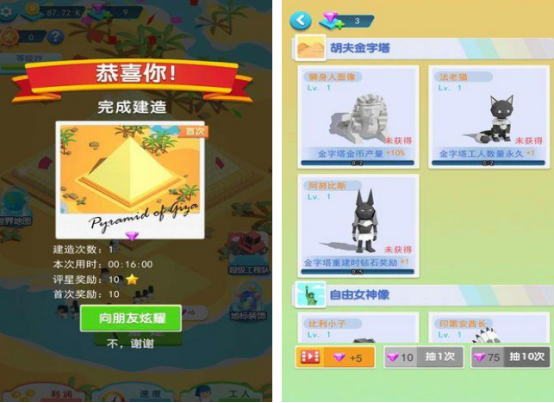 游戏以岛屿拓荒为框架,玩家通过建设住宅、学校、医院等社区设施提升人口承载力,并解锁更高级别的建筑蓝图。在“世界奇观”系统中,金字塔作为稀有S级建筑出现,建造需消耗特定资源组合并满足前置科技树条件。建成后不仅提供大量税收加成,还可触发专属节日事件,增强城市文化辨识度。