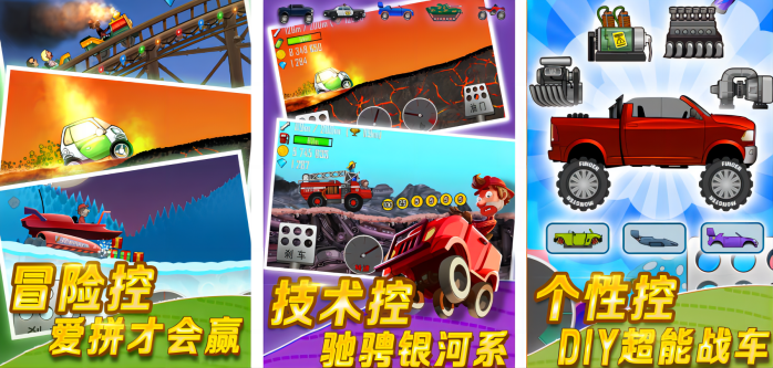 物理驱动型竞速游戏,车辆模型包含越野车、摩托车、坦克等十余种载具,每种具备独立悬挂参数与重心响应。关卡地形含陡坡、断崖、弹簧跳台及陷阱机关,玩家需通过油门/刹车微操维持车身平衡,同时收集金币升级引擎、轮胎、悬挂等核心部件。