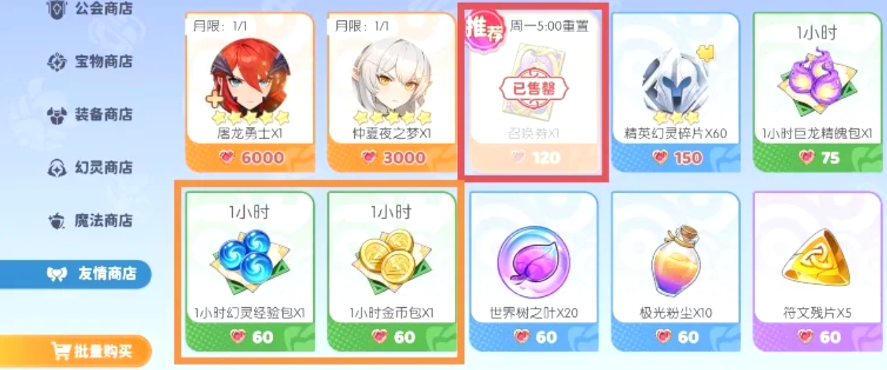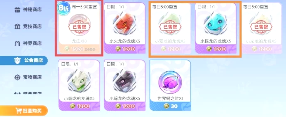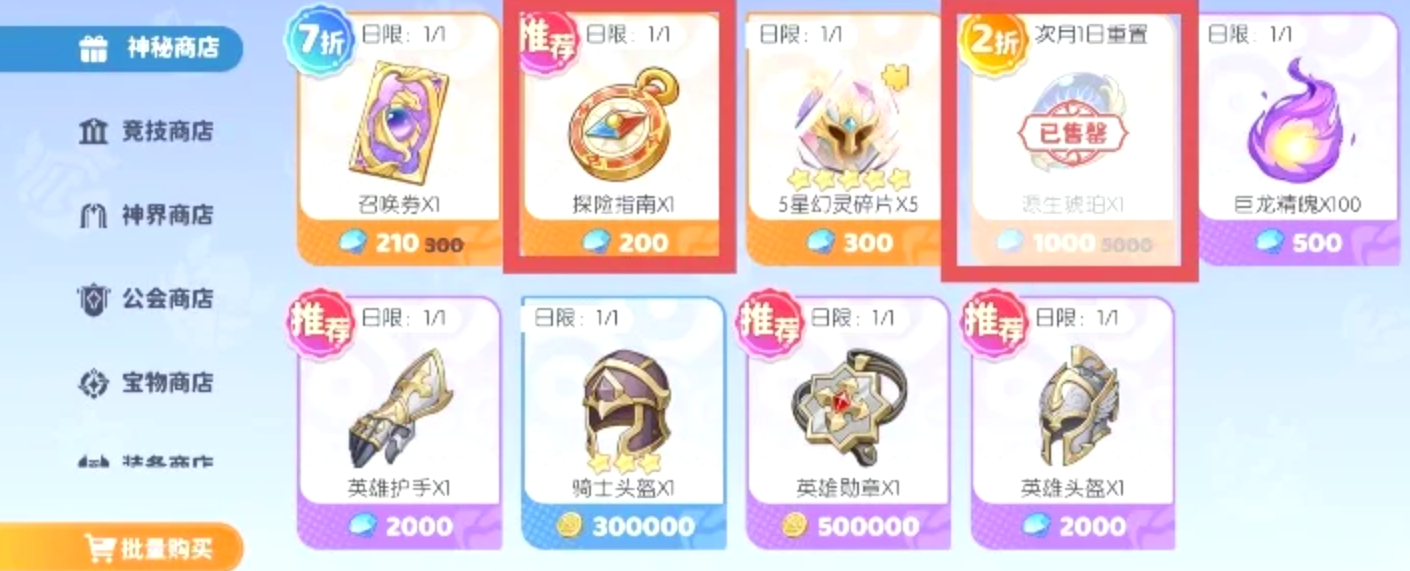 第4个公会商店绝对要优先购买龙血,保证每周都清空,还有小龙碎片,每日清空即可。第5个宝物商店,可以选择购买极光晶石和宝物,两者都可以依据自己的需求考虑是否购买,如果需求量大,那么每日购买即可。第6个装备商店,拥有着各式装备,可以购买史诗和传说的装备,依据需求购买即可,淬炼晶石同理,它可以在装备成型之后刷词条。第7个幻灵商店,在每周或每月的时候,可以购买黄金史莱姆和神话召唤券。第8个为魔法商店,每日必买龙语魔法,并且还必须要了解自己的队伍需求购买,而他的各等级的龙语都可以分解为龙语碎片。