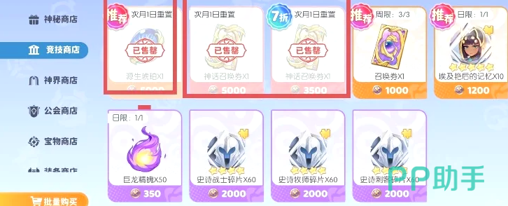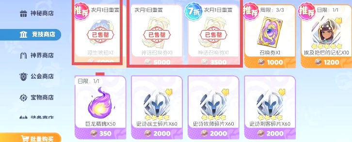 第2个竞技商店则是有着神话召唤卷和源生琥珀,同样两者都推荐购买,当然,源生琥珀优先级要稍微次于神话转换卷,毕竟神话召唤卷的需求量要更大一些。第3个神界商店可推荐购买的物品很多,例如黄金号角,极光粉尘以及宝物,这三者都非常推荐每日或每周购买,但是极光粉尘和宝物需要依据自己的实际情况,如果需求量不大,那么可以减少购买,在宝物的所属类型中拥有着一些通用神器,比较重要的例如所罗门之戒和贤者之石,都是非常值得购买的,而如果玩家们情况特殊,非常急需万蛇之母,那么玩家们也可以考虑购买,不过一般情况下并不推荐,因为这个角色可以通过普池获取。