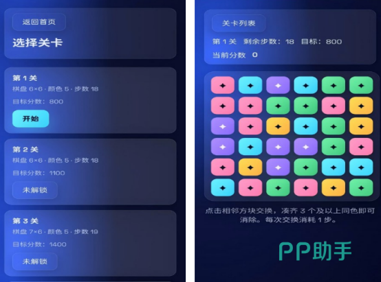 在展开三消闯关的过程当中,这款是以霓虹的玻璃风格为主,你将看到每一个方块在背景颜色的不同,以及里面五角星的颜色也分为黑白这两种。要在每次闯关的过程当中,根据步数以及分数方面的限制,才能够顺利的通过。比如在早期的时候,大家可以看到不仅棋盘较小,颜色也比较少,很快就能通关,但是随着关卡不断提升,难度也会增加,颜色也会更多。