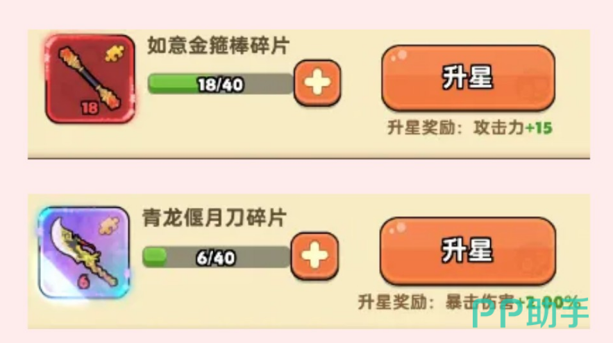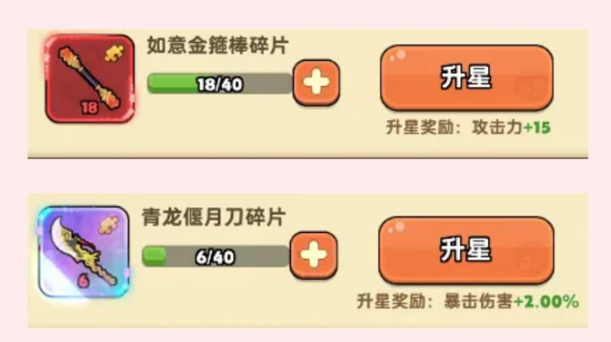 升星不只是让属性变高这么简单,主要在于某些星级会触发技能强化。拿火系的金箍棒来举例子,这个神器算是比较有代表性的。升到3星的时候,会获得技能特性方面的加成,虽然提升不算特别明显,但也能感觉到清怪速度快了一些。真正的分水岭在6星,到了这个级别神器会自带一张技能牌,金箍棒的技能牌叫力大无穷,效果是释放金箍棒时,会额外再释放一次,虽然伤害会减少20%,但是相当于多打了一轮输出,整体收益还是很划算的。