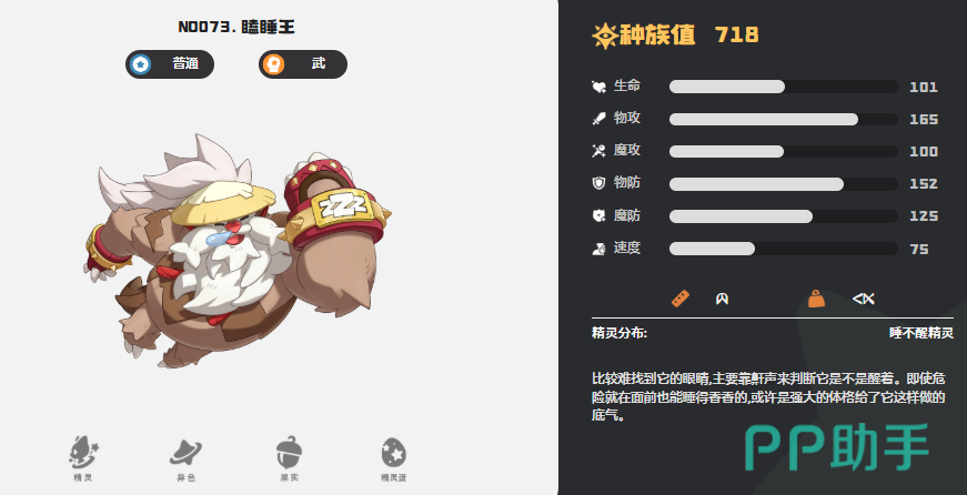 第二个为大家推荐的是瞌睡王,瞌睡王也是属于双系精灵,当前是普通以及武系的几率,利用瞌睡王的效果,大家就要注意它在环境的适应能力上面是非常高的,利用天赋慢热型的效果,他只要在登场之前其他的精灵有过行动的话,那么此时就可以给他自身带来一定的能量累积,所以在此时一定要注意给瞌睡王进行配对的话,他一定不要放在第一个位置,如果放在第一个位置的话,这个天赋一般是触发不成功的,所以在后续前面的精灵有过成功触发,然后在此时瞌睡王就可以得到5点能量积累,此时它的初始能量数值就可以快速的提升起来,就算一进入场内的能量是0的话,大家也不用担心后期没有能量可以释放其他技能。
