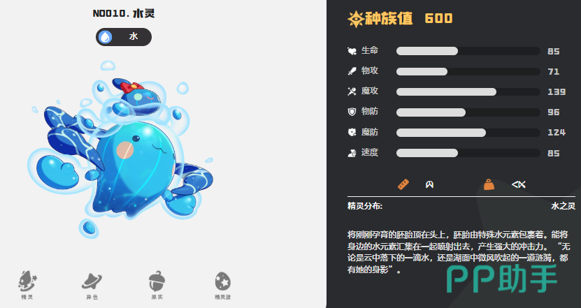 第五个为大家推荐水系精灵当中基础的水灵,水灵作为前期新手玩家很有可能会选择的一个核心宠物,它自身的技能效果是可以快速将周围的水元素吸收起来,然后喷射出去,带来的强大冲击能力是非常不错的,而且使用手感是非常简单的,后期利用他的天赋浸润,可以让水灵在使用自身带来的水系技能时,让所有技能在消耗量上面都减少一点,所以通过这样的方式可以让他在能量积累上面快速积累起来更多的数值,使用各种技能的时候,能量消耗少了,之后它带来的连招也会更多一些。