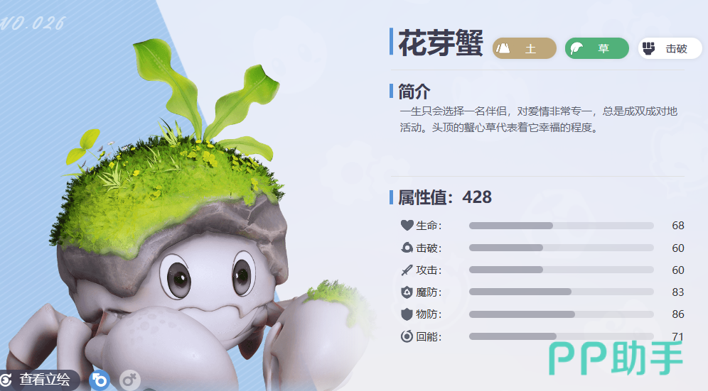 其实在当前大家想要搭配土系阵容的时候,就要注意至少其中的核心角色是一定要用土系角色,来进行达成的元素触发的,而其他的宠物大家也可以查看一下有没有更适合跟他进行搭配,但是不会克制他元素效果的其他队友,那么这里建议大家在搭配土系这种的时候,第一个可以用花芽蟹,因为花芽蟹当前的能力当中属于土系跟草系双系别的一个击破类型宠物,它当前基础的属性值达到了428,后期再能力效果上面可以带来更多钻地的技能,而且在出现区域当中也比较多,不管是云上草原还是青石台都可以获取它,如果花芽蟹在探索当中想要带来更多能力的话,就是可以进入钻地的状态,免疫一些远程的攻击,而且在其中如果遇到同样消耗体力的技能,是他可以搭配其他的队友进行一部分的防御。
