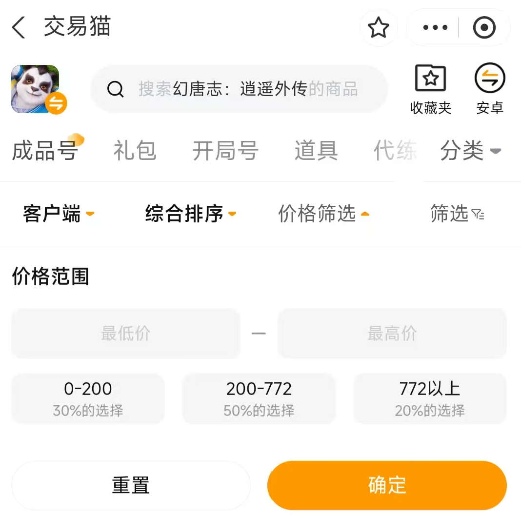 交易猫平台的账号数量非常多,很多玩家在交易的时候感觉寻找太麻烦了,尤其是一部分账号的价格已经超出了自己的预算,那么就可以使用价格筛选功能,这样能直接筛选出符合自己预算的账号,减少挑选的时间哦。