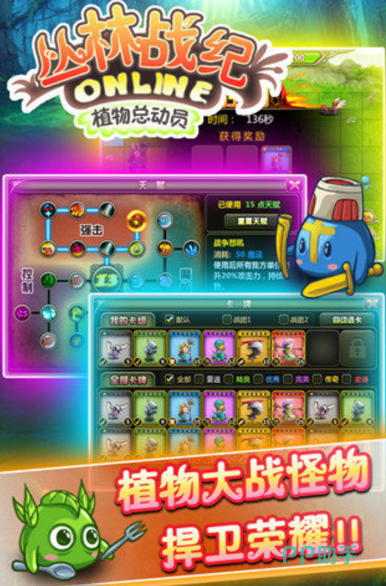 把塔防和卡牌结合起来的玩法,在这个游戏里做得还算成功,玩家需要收集不同属性的卡牌,来组建队伍,然后布置防御阵型抵挡怪物进攻。PVP对战支持1v1和2v2模式,低等级玩家通过合理的阵型搭配,也有机会赢。关卡设计有200多个,包括单人和组队副本,不同地形,会影响战斗,沼泽会降低移动速度,夜间关卡里,怪物攻击力会变高。宠物系统提供了属性加成、辅助技能,丰富了战术选择。