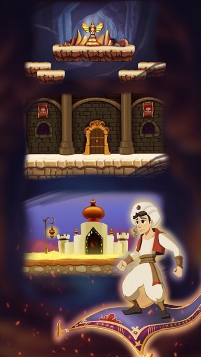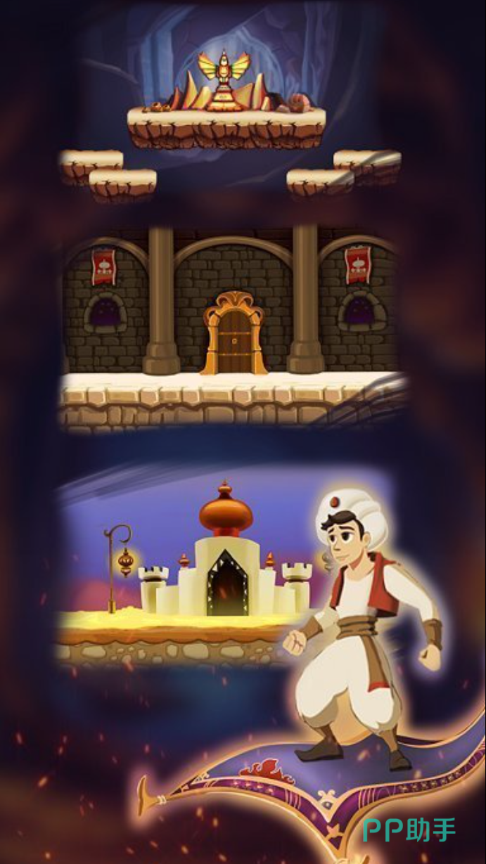 像素风格的画面,构建出了六十个关卡分布,在十个世界里,玩家要操控阿拉丁穿越雨林、山脉和洞穴这类场景。关卡里设置了滚石、毒刺、野兽这类障碍和敌人,跳跃、飞行、游泳这些技能,要配合使用才能通过。技能系统允许解锁滑翔、隐身、火焰喷射等能力,滑翔帮助跨越悬崖,隐身躲避敌人,火焰攻击远处目标。