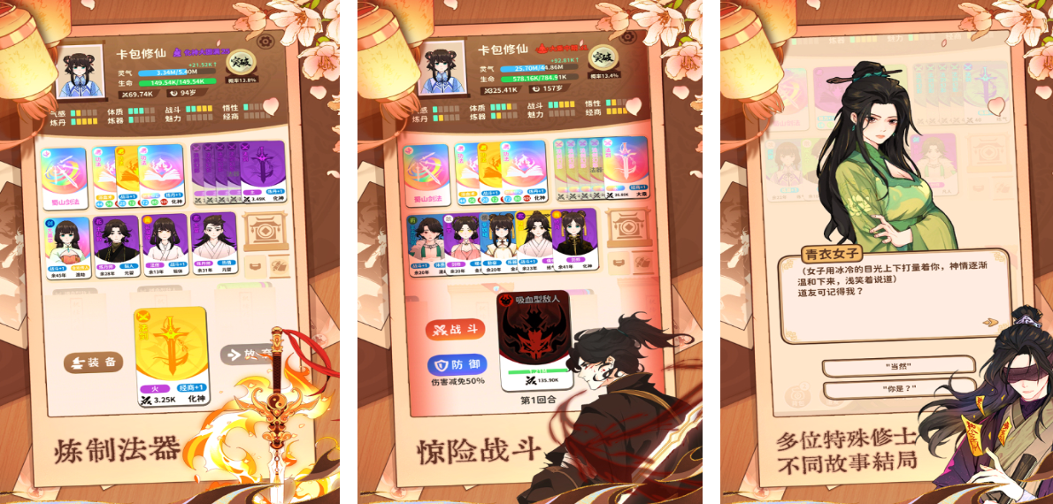 《卡包修仙》营造出一个带有策略深度且随机趣味的修仙世界,把原本抽象的灵力运转变成了有很强实用性的功法卡牌。玩家扮演的是出身于草莽的散修,在未知的秘境中依靠合理的灵石分配和词缀组合来打败对手。由于游戏流派组合自由度很高,摸牌机制又带有不确定性,所以每次的选择都会带给玩家们不同流派的体验。游戏还带有经典的地牢推图模式,更是加入了自创功法系统,玩家们能够在游戏中自创修仙的上乘功法。