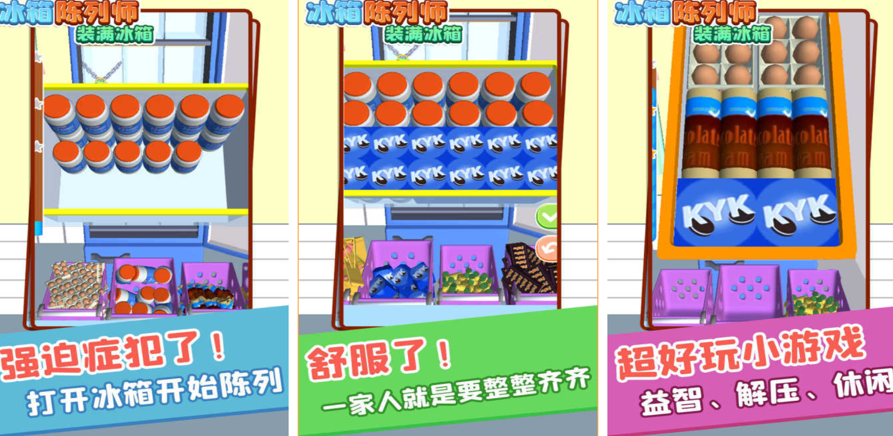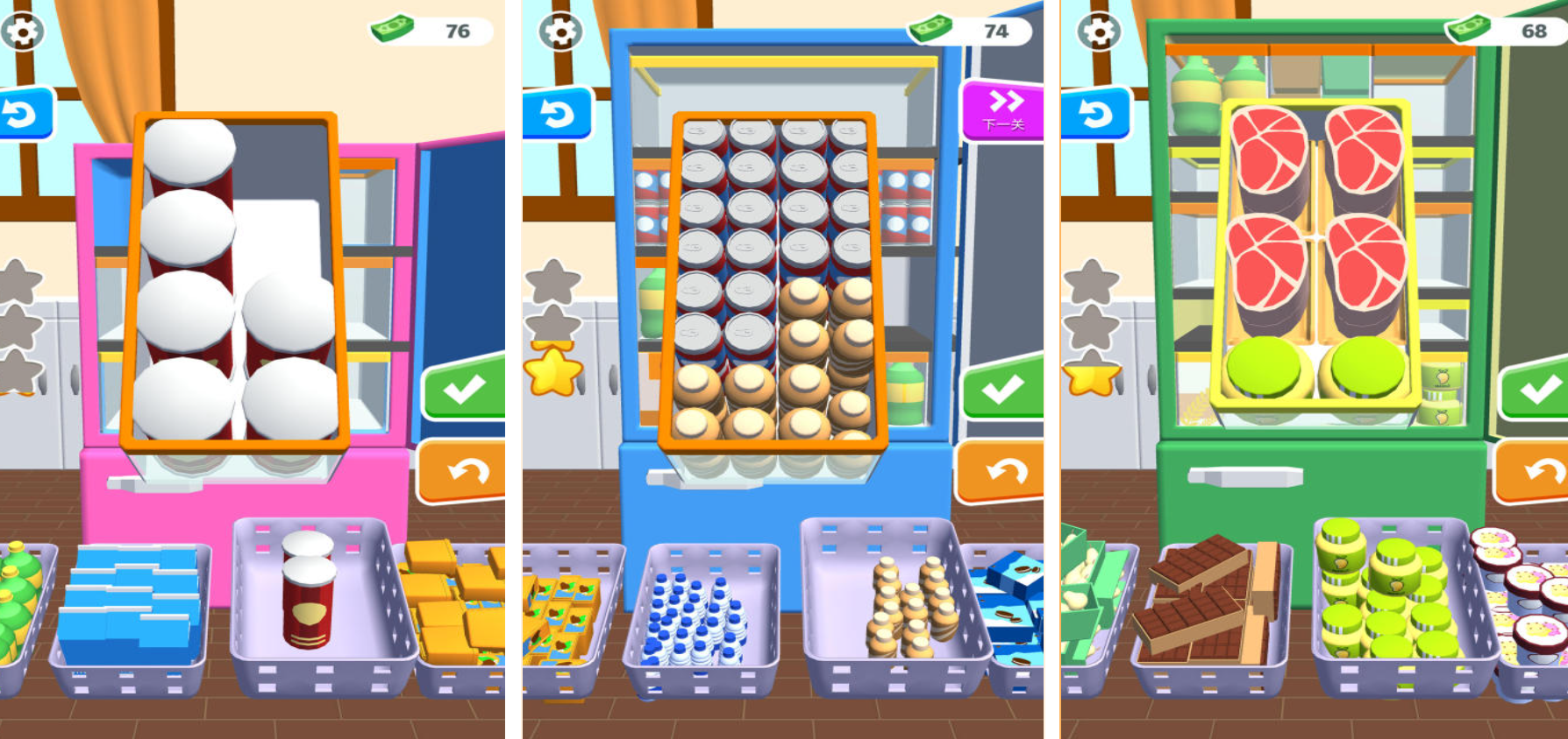 《冰箱陈列师装满冰箱》创建出非常写实且充满色彩韵律的虚拟厨房,游戏的主要玩法很好地表现出了物品堆叠逻辑和空间分配的互动细节。玩家进入游戏之后要面对堆积如山的购物篮,用拖拽的方式把各种尺寸的苏打水、酸奶、水果和肉类塞进冰箱侧门或者层架里。这种将几何认知同生活常识紧密联系起来的设计,让每一场冷藏室的空间博弈都充满成就感。当隔板高度有限时,玩家可以借助转动角度进行缝隙穿插,获得极度的视觉治愈感。