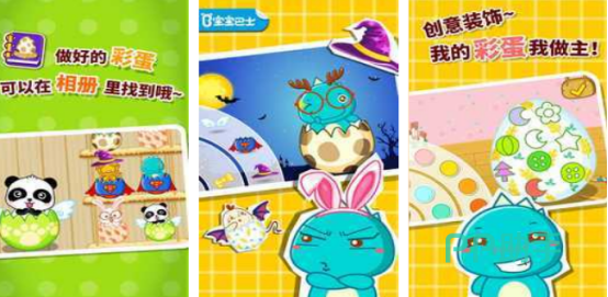 这是专为小朋友设计而成的彩蛋类手游,有超级可爱的人物表情,也提供超级丰富的色彩和花纹让孩子自由选择底色,比如涂抹颜色或者粘贴花纹,最终打造出个性化彩蛋,内置较多超萌的角色,有小兔子和机器人,在装饰或者匹配的过程当中,轻松提升儿童的审美和创造力。