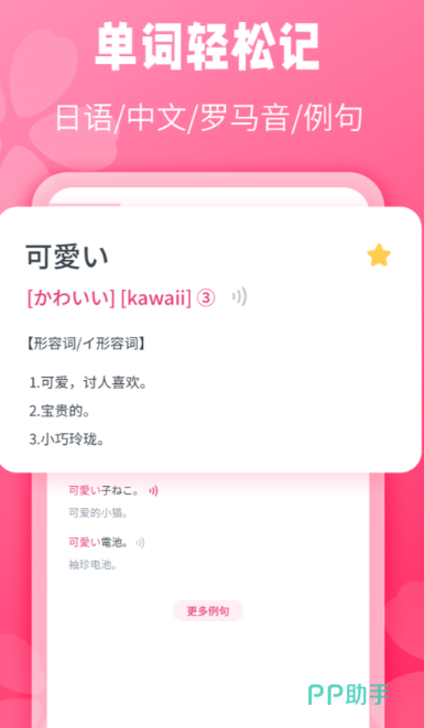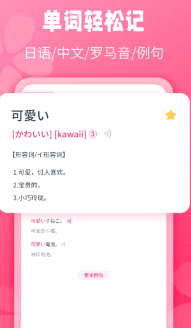 顾名思义,这个程序把所有的注意力都放在了对“词汇”的掌握和理解上。内建有涵盖所有 JLPT水平,日语专业四级,八级等多个权威词典。本教材除附有语音、定义外,还附有大量范例,并配有高品质的中英文译文,可让使用者在特定情境下,更好地了解使用方法。它的内存运算法则是按照艾宾浩斯的曲线来编排的,并且可以让使用者自己给自己的字加上标签。