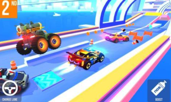 本作定位休闲竞技赛道,采用3D卡通渲染风格,角色与赛车造型圆润灵动,色彩明快。支持本地Wi-Fi与在线匹配两种四人同场模式,每局比赛设有随机机关(如弹跳板、减速气流、瞬移光门),平衡技术门槛。物理引擎兼顾趣味性与合理性,碰撞反馈具备重量感,转向响应灵敏且可调节灵敏度。车辆改装系统覆盖外观涂装、氮气罐容量、悬挂硬度等十余项参数,策略性与娱乐性并存。