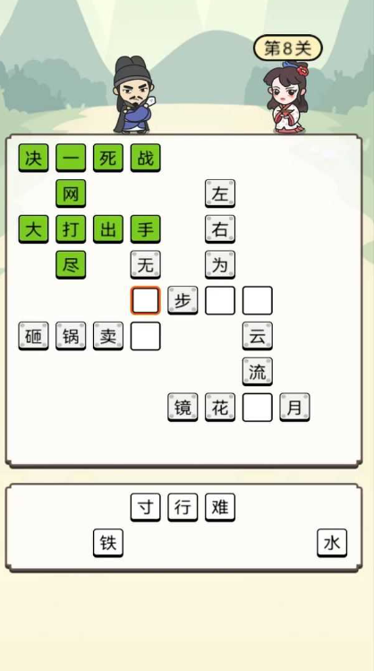 突破线性接龙框架,采用动态网格填空机制。每关设定不同路径逻辑——如竖向串联、横向延展、螺旋递进等,配合限定字库进行成语重构。操作直观、反馈即时,成功组词即触发通关动画,显著增强正向激励。玩法包容性强,儿童可练字词组合,成人可验知识广度,真正实现寓教于乐的普适价值。