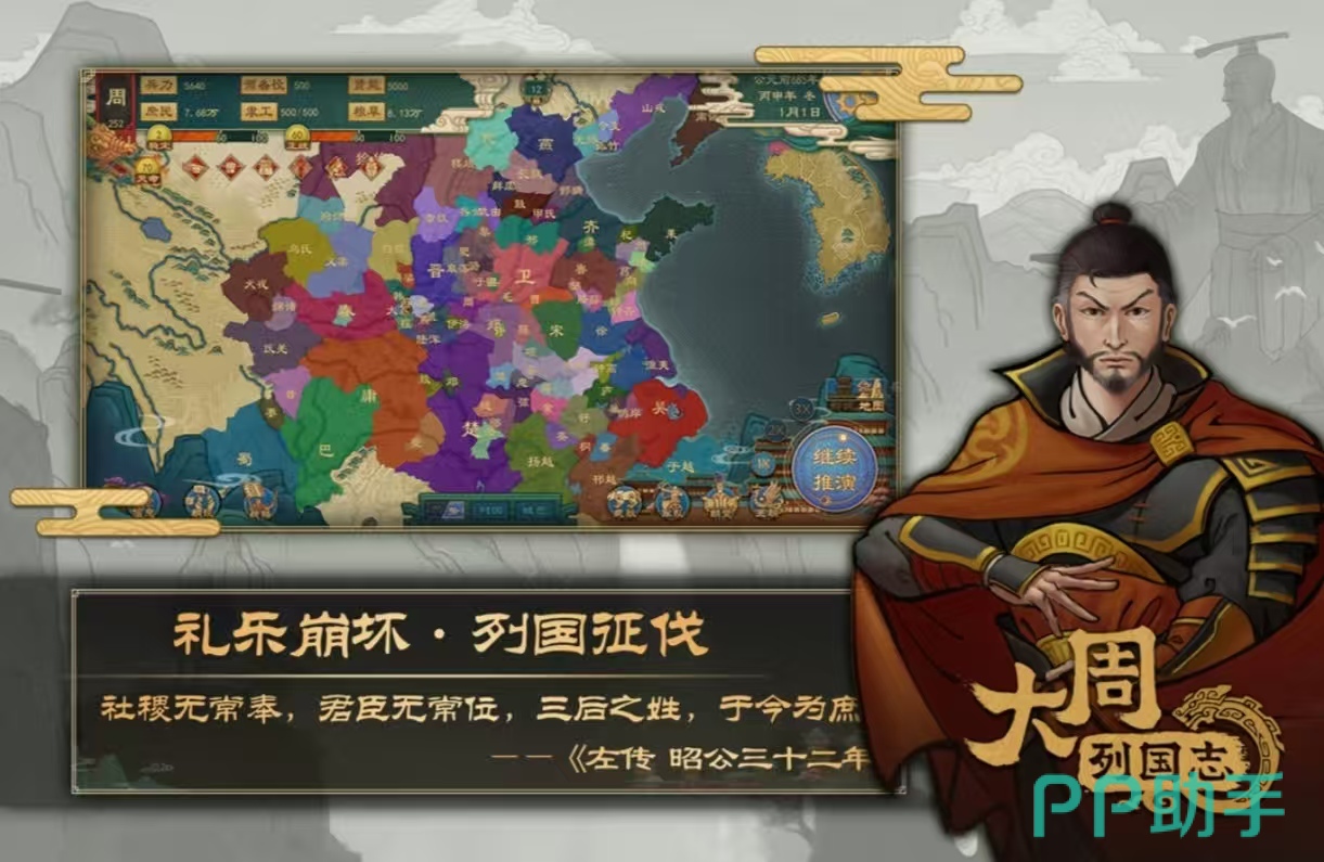 以西周至战国时期为历史框架,玩家扮演诸侯国君主,经历分封建国、礼乐治国、变法图强等阶段。游戏内置完整年代演进系统,涵盖人口增长、赋税改革、外交结盟、合纵连横等机制;武将属性细分为武力、智力、政治、魅力四维,影响内政执行效率与战场指挥加成,历史战役关卡均依据真实事件改编并加入策略变量。