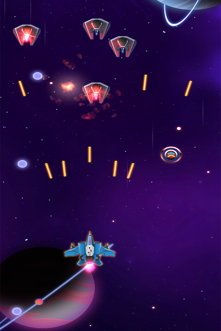 复刻经典街机弹幕射击手感,以“守护银河生命线”为核心使命。采用像素级精修建模与粒子光效系统,呈现超高速机动下的激光折射、等离子尾迹与爆炸冲击波。敌方单位按威胁等级划分为侦察机、拦截机、母舰三阶,每类具备独特AI行为树与攻击节奏。击毁目标后掉落功能性组件——包括提升火力密度的脉冲增幅器、扩展护盾容量的能量矩阵、强化机动性的矢量喷口套件等,形成动态成长链路。