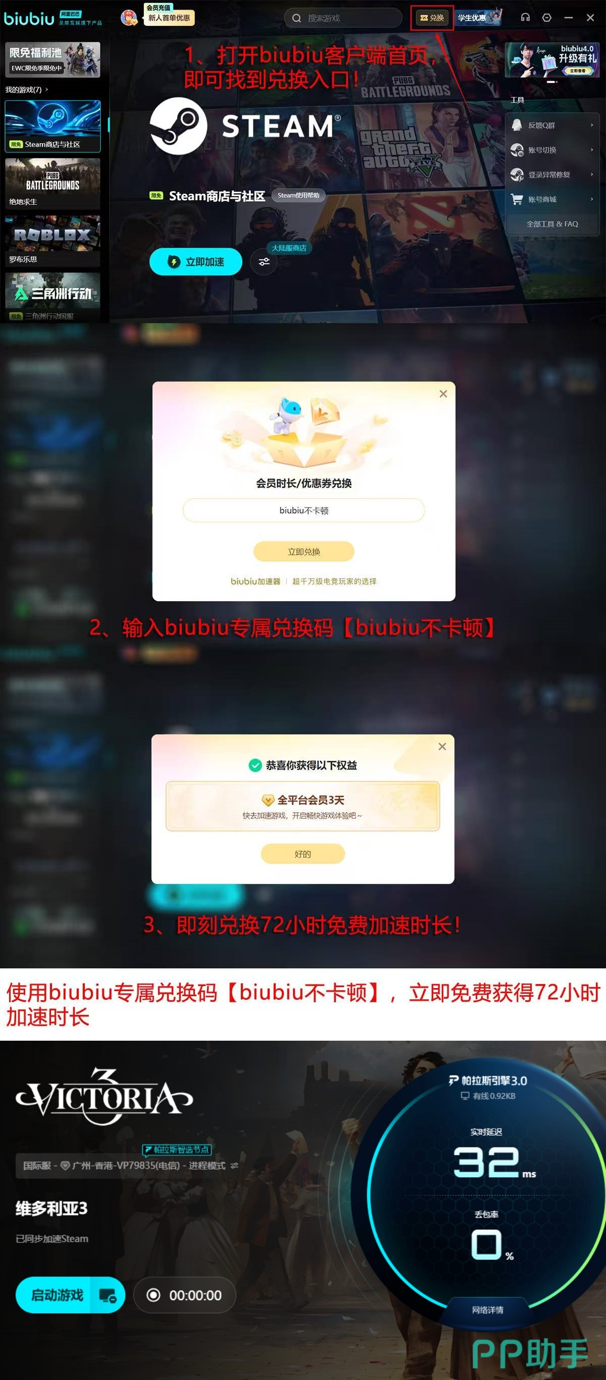 新用户注册后可立即获得24小时基础免费加速权益;在客户端主界面“兑换中心”输入专属激活码“biubiu不卡顿”,还可额外领取72小时加速时长。两项福利可叠加使用,总计享满4天全平台通用加速服务,覆盖Windows、macOS及主流模拟器环境。