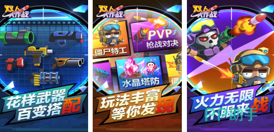 主打本地双人同屏的快节奏射击体验。采用左右分屏布局,支持合作打僵尸、双人塔防、迷宫枪战三种核心玩法。任务体系覆盖闯关推进、限时围剿、生存守点等多种目标形式,操作响应灵敏,无复杂技能树或养成负担。强调即时反应与默契配合,是聚会场景下快速点燃气氛的理想选择。