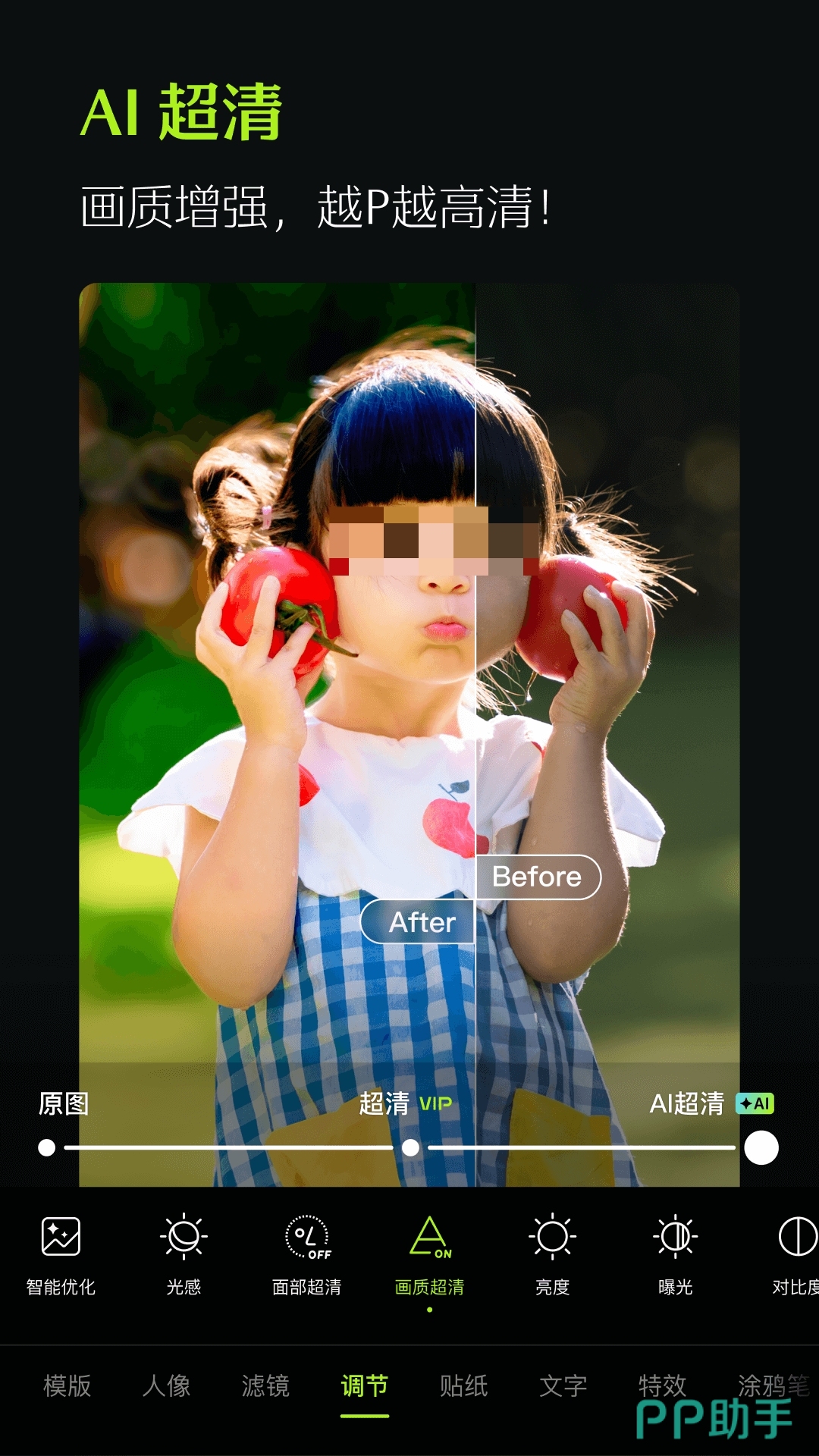 醒图很擅长调肤质、调五官立体感,修出真实又自然的原生美感。除了修人像特别顺手,它的修复功能也很实用,导入模糊或低像素的照片,用它这个功能处理一下,细节能补回来不少,整体清晰度提升很明显。
