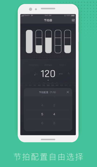 该软件采用“二合一”的设计思想,使使用者能够在不需要转换应用程序的情况下,同时兼顾调音和节奏这两大基本要求。常用的选项卡或分页式的设计,一种是直觉式的调音表,一种是全功能的节拍器。它的调音部分可以对常见的乐器进行设置,而在拍子部分可以进行基本的速度调节、拍音调节和音色调节。