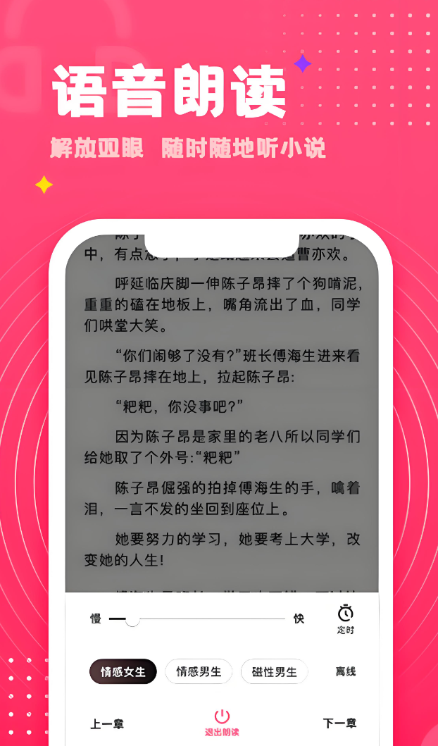 在业内之中算是听书内容极为丰富,也有着研发的高清通话系统,让播放出来的人声温柔、细腻,平台当中有二十多种真人预录音色可选,单作为音频平台来说专业性都相当足够,在小说中也有特别多爆款IP的作品登录,很多几十万字的篇幅小说放在身边即可流畅听书,还能调整它的播放倍速和语速。