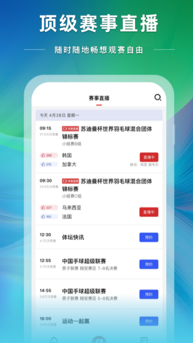 《央视体育》凭借央视大背景,为国内外的用户提供了精彩的体育赛事,且覆盖面广。APP支持预约、签到和回看功能,用户可以选择任意时间去欣赏比赛,帮助用户不错过任何一场精彩赛事。通过该APP还能看见运动员幕后独家花絮,让你了解运动员最真实的生活状态,满足了个性化需求。无论是什么类型的比赛,你都可以实时查看。