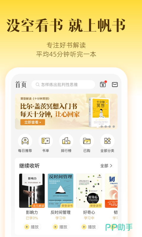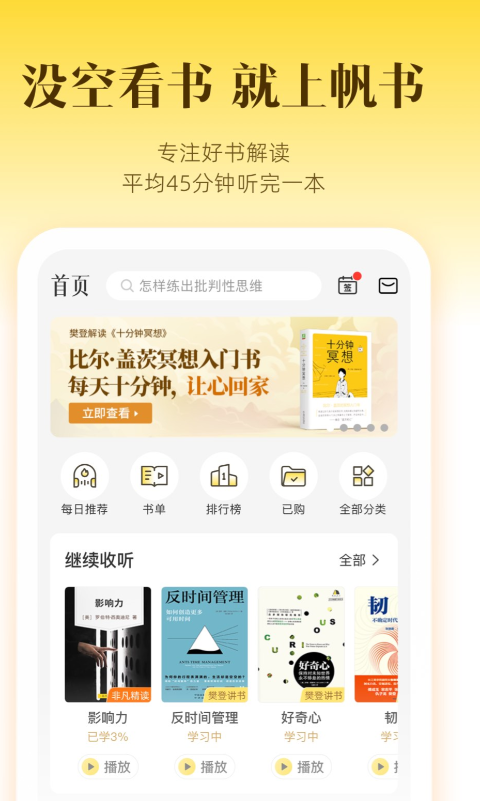 帆书这款软件提供的书籍多数也是比较专业的,而且为了能让用户们阅读多更多的书籍,会定期提供阅读的小习惯,这些习惯可以帮助大家快速阅读,这样就能找到这本书的精髓,后续如果写作品或者作文的时候,能发挥出很大的作用哦。