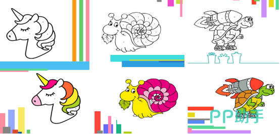 提供独角兽、小动物等数十种线稿模板,采用大色块分区涂色机制,降低操作门槛。24色标准色盘支持自由切换,帮助儿童建立基础色彩命名体系与视觉辨识能力,同时提升手指协调性与专注力持续时间。