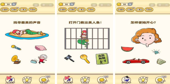 设置多主题谜题矩阵,包含人物情绪调节、物品功能重构等开放式问题。典型题型呈现滑稽角色与钱、汽车等道具组合,要求突破常规因果链寻找非常规解法。隐藏彩蛋机制通过屏幕点击触发,增强探索动机与正向反馈循环。