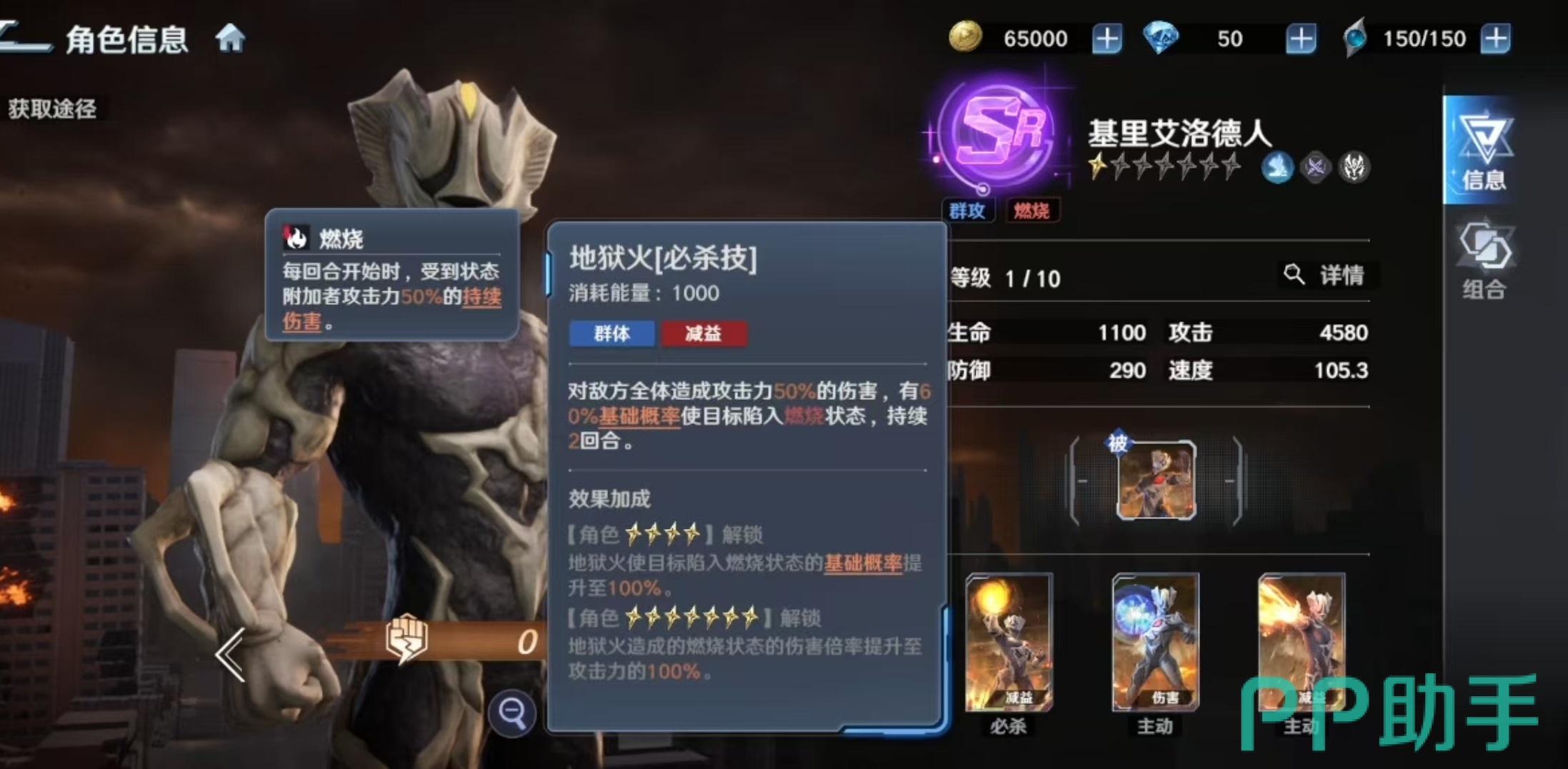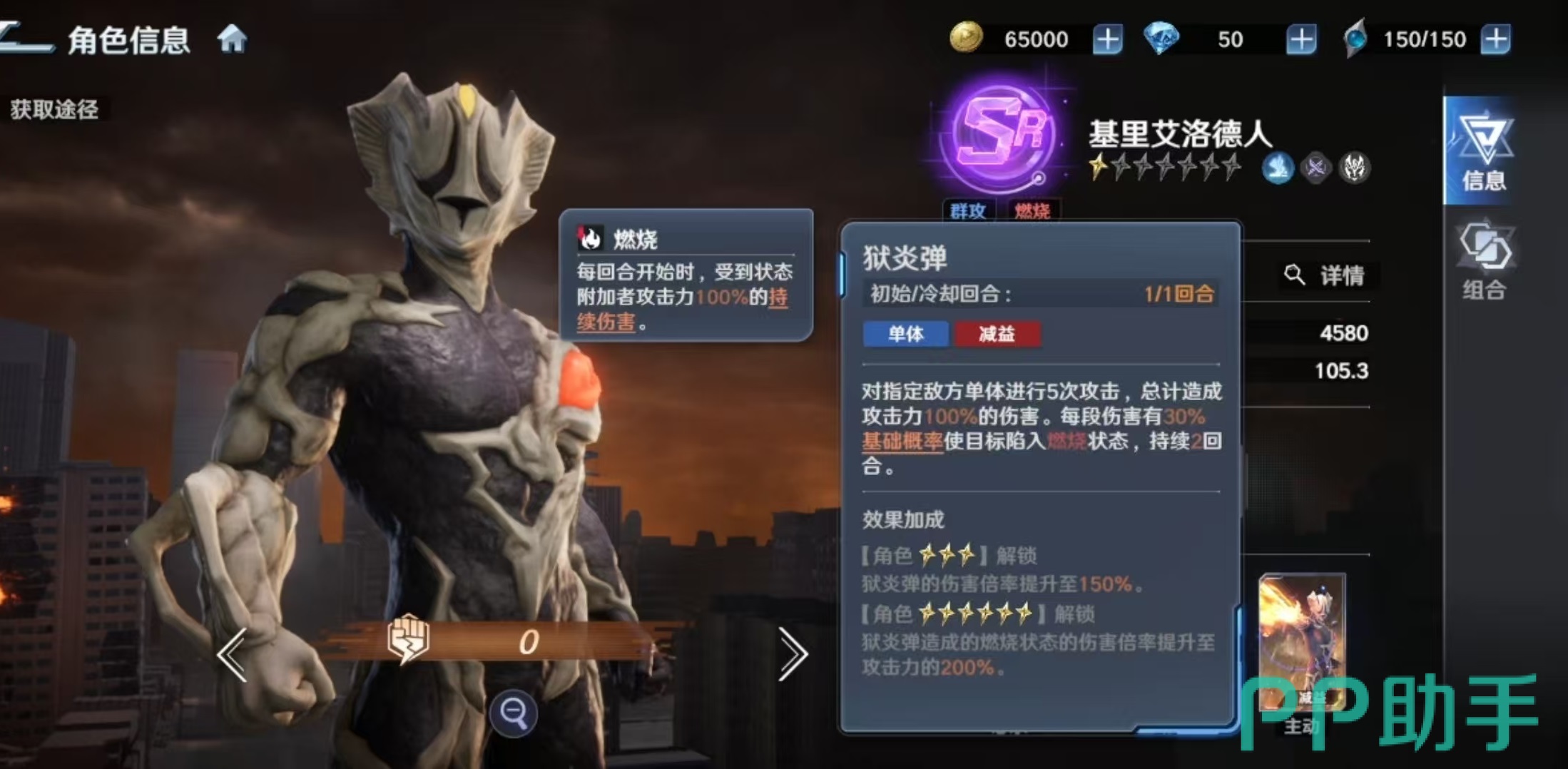 基里艾洛德人的核心机制围绕“燃烧”异常状态构建。其被动技能在战斗初始即提升自身效果命中率20%,显著强化燃烧施加稳定性。必杀技“地狱火”可对敌方全体造成伤害,并附带燃烧状态,持续2回合;当角色升至满星后,该技能触发燃烧的基础概率提升至100%,同时伤害倍率同步提升至100%。被施加燃烧的目标,每回合开始时将额外承受相当于施放者50%攻击力的持续伤害。虽单体爆发有限,但群体覆盖率高,配合多目标燃烧可形成可观的持续输出压制。