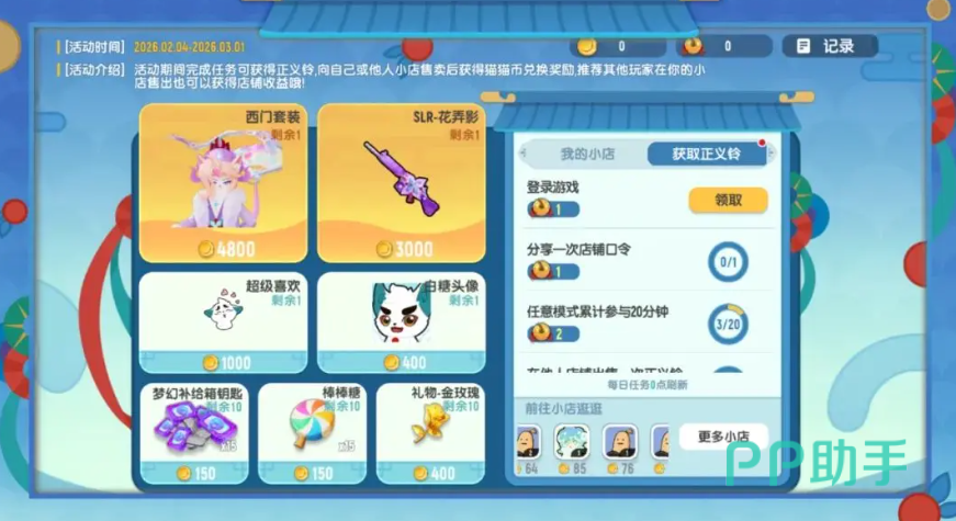 2月4日到3月1日,在这个期间只要完成任务,就可以拿到正义铃,向他人小店或自己售卖后,可以拿到猫猫币,如果有其他玩家在自己的小店售出,大家也可以获取额外的猫猫币。