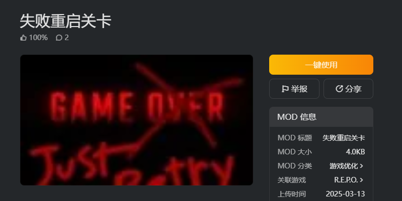 3、失败重启关卡:这个建议大家都用上,这个游戏玩法是一旦角色死亡,之前努力得来的道具都会消失,重头再来会花费很长的时间,装上该mod之后就能重启当前关卡,地图也不变,健康值也会默认为100,让大家更好的继承进度。
