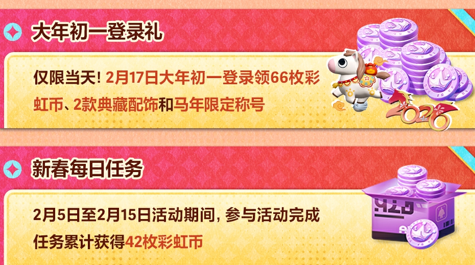 新年登录礼面向全体玩家开放,仅限2月17日(农历大年初一)当日登录领取。奖励包含66枚彩虹币、两款典藏级配饰及专属马年限定称号。同期开启的新春专项每日任务,完成后总计可获42枚彩虹币。另有“蛋仔岛红包雨”活动,由新春小马全程派发,参与即得至少25枚彩虹币。此外,“疯狂星球六”活动将于每周六定时开启,整个新春周期内共可获得24枚彩虹币。