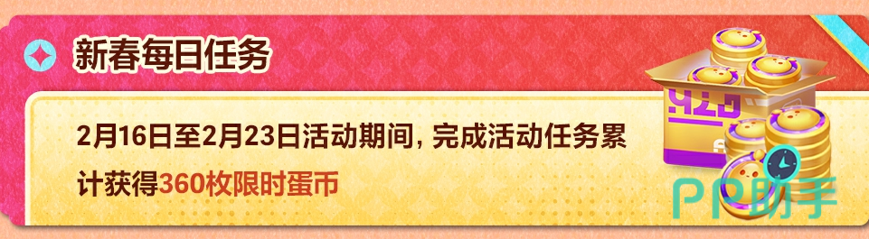 新春每日任务同步上线,共设七日周期,每日均有独立任务目标。每完成一项即可获得对应蛋币奖励,累计最高可得360枚。同样属于限时道具,请合理规划使用节奏。另设主界面活动视频观看入口,完整观看后可即时领取40枚限时蛋币。