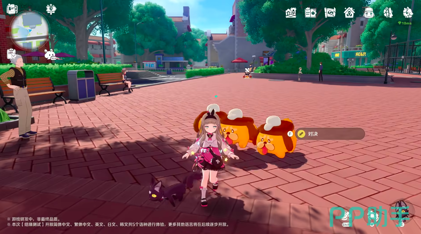 在视觉表现层面,游戏采用全3D建模呈现伊亚镇街景,城市建筑群、道路肌理与环境植被均按真实比例布局;同步搭载动态昼夜循环系统,晨雾、正午光影、黄昏暖调与夜间霓虹随真实时间流转,显著强化场景沉浸感。当前版本共实装66只可结缘精灵,每只均完成独立高精度建模与动作绑定,外观细节涵盖毛发质感、服饰纹理及交互微表情。