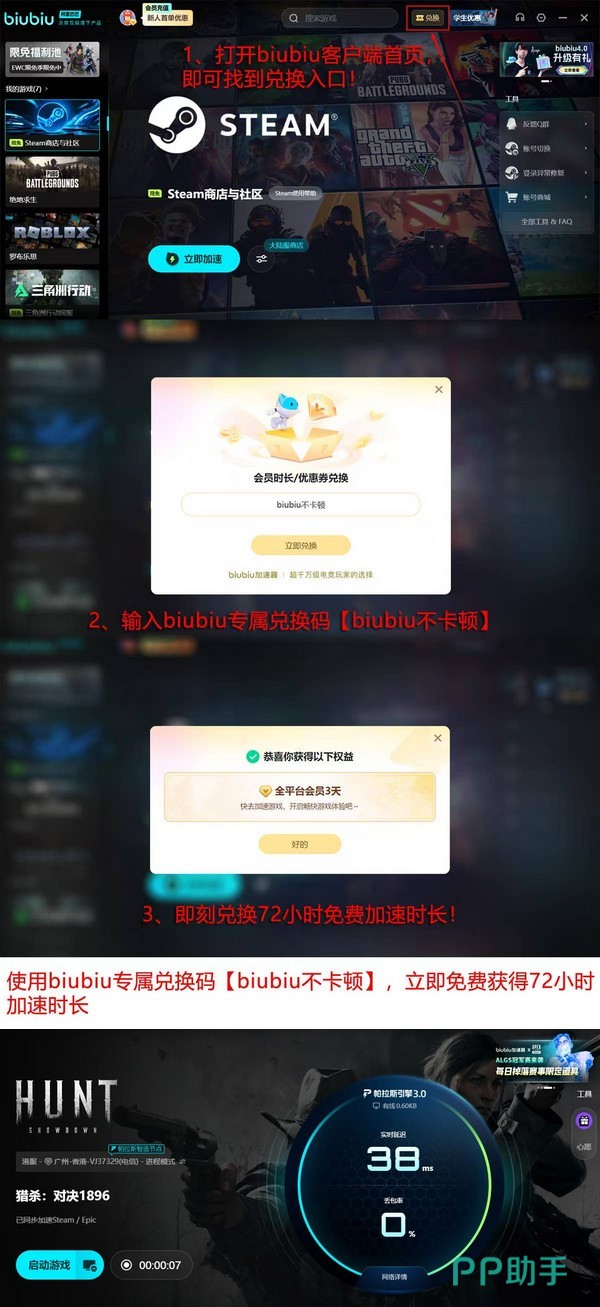 新用户可通过双重方式获取免费试用权益:注册即赠24小时全功能加速时长;首段体验结束后,于兑换窗口输入“biubiu不卡顿”(区分大小写),即可额外领取72小时加速权限。该激活码面向所有用户开放,限使用一次,无需绑定设备或支付信息。