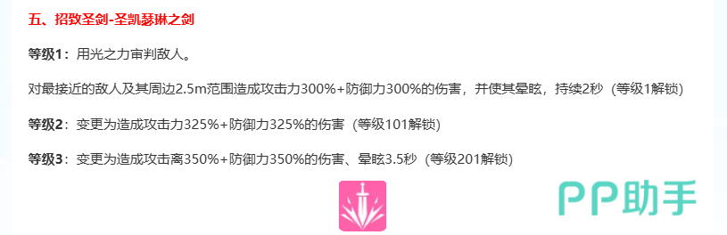五技能【圣凯瑟琳之剑】为终结型范围审判技:对最近一名敌人及其周边2.5米范围内所有目标,同时造成300%攻击力与300%防御力的双重伤害(二者叠加结算),并附加2秒群体眩晕效果,适用于BOSS战拉扯或群怪爆发阶段的关键控制节点。