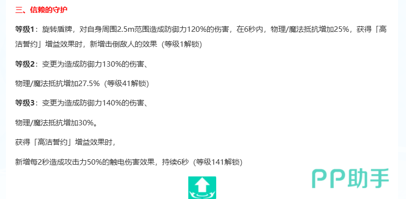 三技能【信赖的守护】是范围性防御输出技:展开盾牌持续旋转6秒,对半径2.5米内所有敌人造成120%防御力的物理伤害;同时在技能生效期间,自身获得25%物理抗性和25%魔法抗性;满级后具备概率击倒效果,进一步提升群体控制覆盖率。