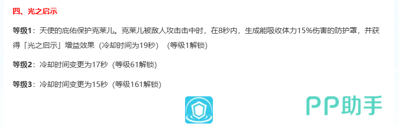 四技能【光之启示】为高价值防护技:开启后生成一个可吸收克莱儿15%最大生命值的护盾,持续8秒;若护盾存在期间成功触发该技能效果,则将转化为“光之启示”增益状态,大幅提升属性收益。该技能冷却时间为19秒,需精准规划释放时机,避免状态空窗期。