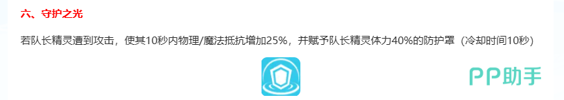 六技能【守护之光】为队长技:当克莱儿作为队长时,若自身受到敌方主动攻击,立即激活10秒的全局增益——全队成员获得25%物理抗性与25%魔法抗性提升;同时,队长精灵将额外获得相当于其40%最大生命值的护盾。该技能冷却时间为10秒,属于战略级防御资源,需配合其他减伤技能协同使用,保障前排持续承伤能力。