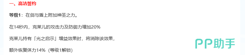 一技能【高级誓约】为核心增益技:施放后赋予自身14秒的攻防双增状态,攻击力与防御力同步提升20%。若此时克莱儿已处于“光之启示”增益下,主动解除该誓约效果可立即恢复40%最大生命值;此外,在增益持续期间,每2秒对周围敌人追加一次基于攻击力50%的触电伤害,具备持续压制能力。