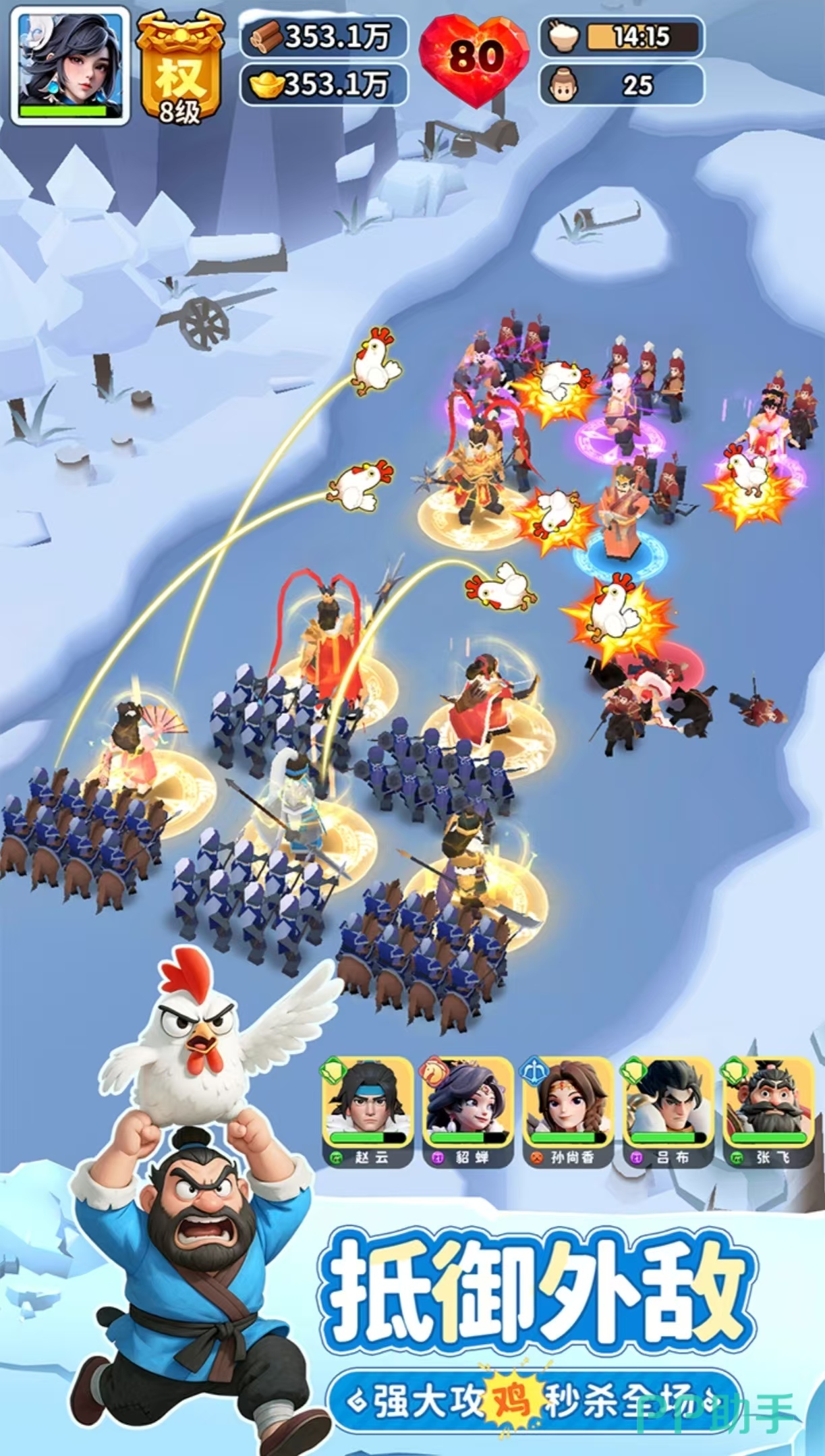 《三国:冰河时代》大家可以在三国时代打造一个小镇,通过不断的招募村民们来发展和建设,通过伐木,打猎等方式来获得资源,升级住宅不断的建造兵营。家园的领土可以不断进行扩大,通过招兵买马等方式提高国家的战斗力,每天登陆都会赠送很多强力的角色,可以自动集结英雄们对抗boss,在离线的状态下也有很多的资源收获,或者委托其他的盟友进行管理。
